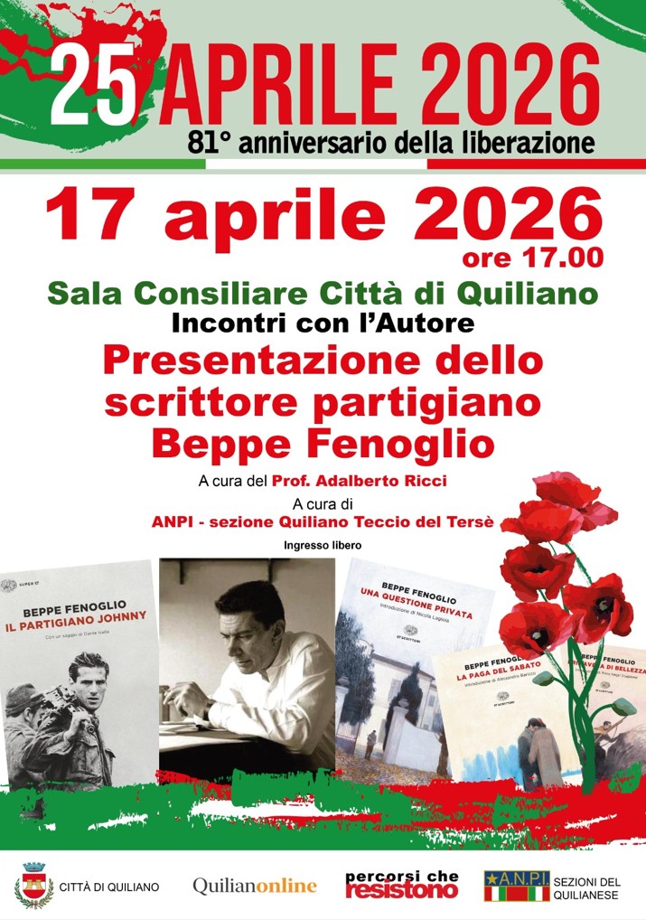 Venerdì 17 aprile 2026 alle ore 17.00 presso la Sala Consiliare in Piazza Costituzione a Quiliano, si svolgerà la presentazione dello scrittore partigiano Beppe Fenoglio, a cura del Prof. Adalberto Ricci. Iniziativa promossa da ANPI Quiliano sezione Teccio del Tersè.